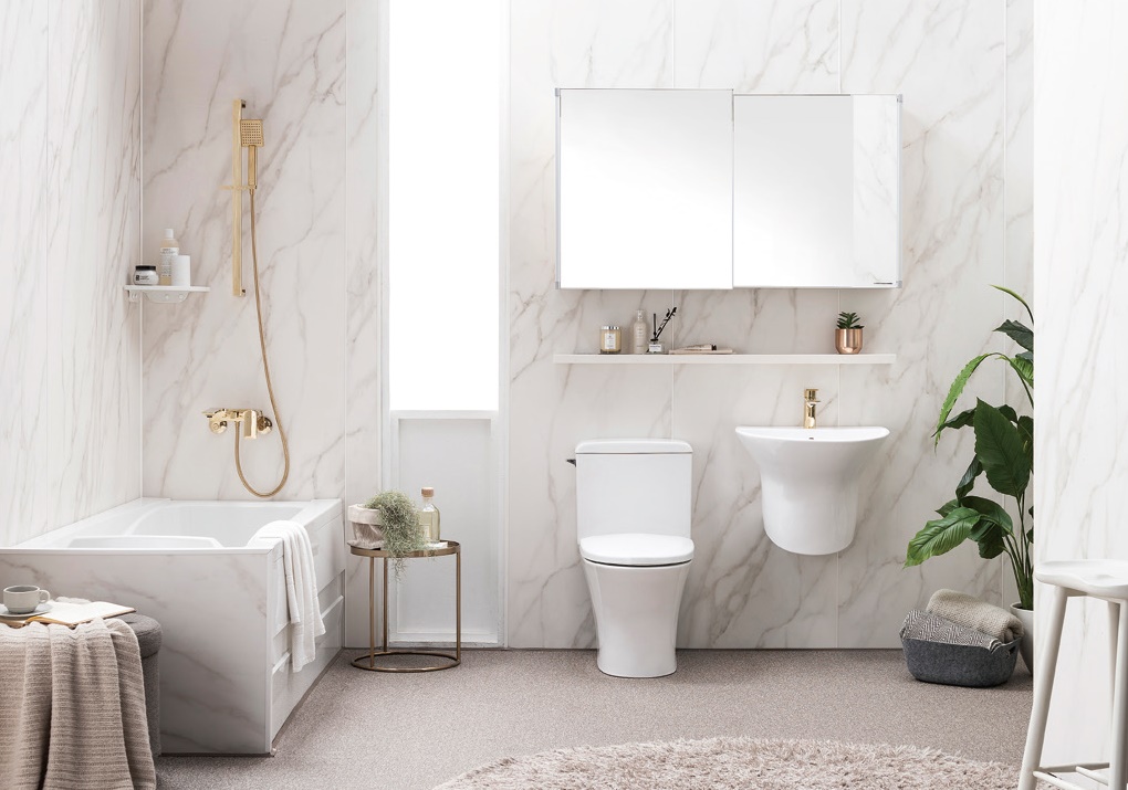 화사한 카라라 패턴과 고급스러운 골드 수전의 세미클래식 바스